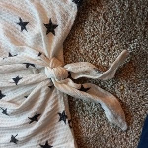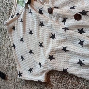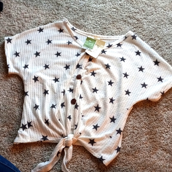 cute white top with blue stars brown buttons and a tie around the belly