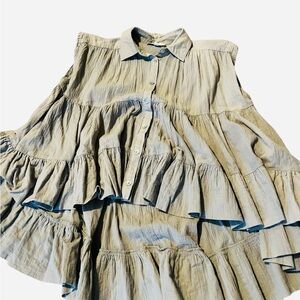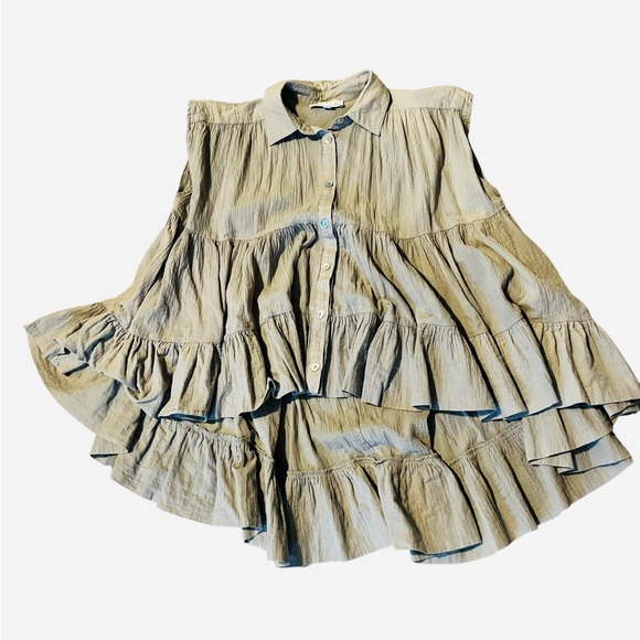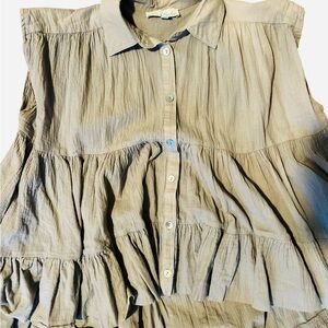 Sleeveless blouse with ruffled layers. Button-up front. Lightweight and stylish.