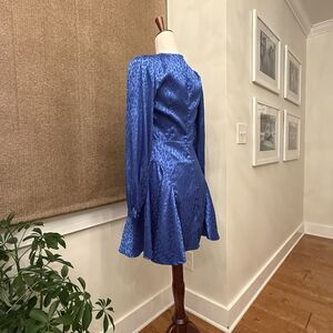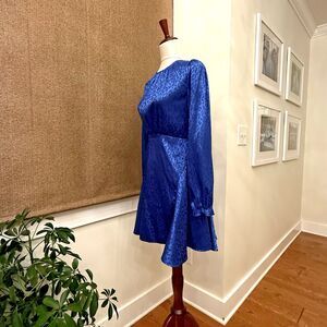 This stunning Pinch Boutique dress features a rich royal blue satin fabric with a subtle leopard damask print. The structured design, long sleeves with covered buttons, and pleated round neckline create an elegant silhouetteperfect for special occasions.