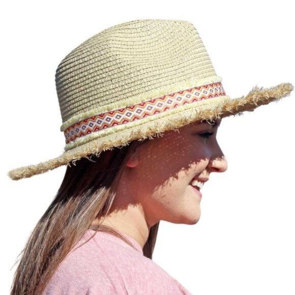 Pinch Front Straw Fedora Sun Hat Natural Southwestern Band OS NWT