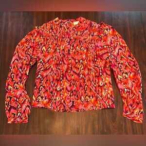 This stylish blouse from Pinch features a vibrant pink and red graphic print, complemented by elegant puff sleeves and a chic mandarin collar. The ruffled details add a touch of femininity, making it a perfect choice for both casual and formal occasions.