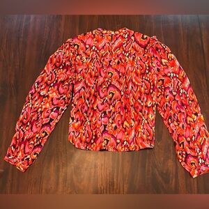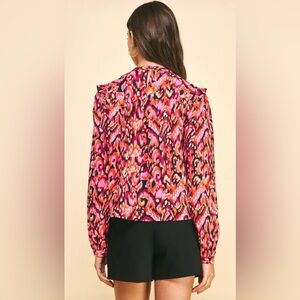 This stylish blouse from Pinch features a vibrant pink and red graphic print, complemented by elegant puff sleeves and a chic mandarin collar. The ruffled details add a touch of femininity, making it a perfect choice for both casual and formal occasions.