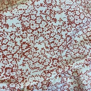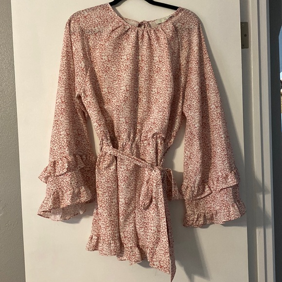 Open back, long sleeve romper. This is a silky material. It is red and white. Ruffled sleeves and a detachable matching belt that can be tied in the front. In perfectly new condition.