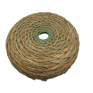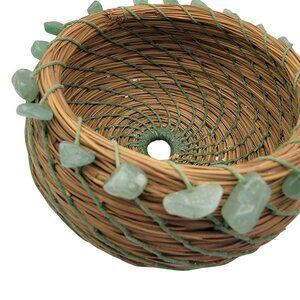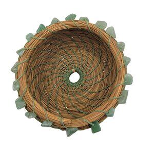This woven basket combines natural pine needles with gemstones and green thread accents. Its intricate design and unique materials make it a striking piece for decorative or functional purposes, adding a touch of nature's elegance to your home.