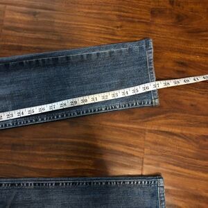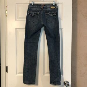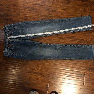 Pine IV Jeans Size 27. 98% Cotton, 2% Spandex. The jeans have 5 pockets and orange and red stitching. Pockets with a flap on the back. These are in excellent, pre-loved condition.  They come from a non-smoking home.