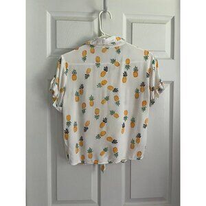Japna brand button down pineapple blouse, size small. Good condition but does have very slight pilling. A cropped fit with tie front at bottom. Sooo cute!