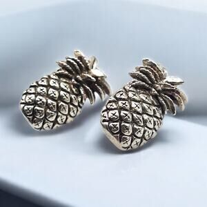 These vintage-inspired silver-tone pineapple stud earrings feature a unique crisscross pattern, ideal for adding a touch of nostalgia to any outfit.