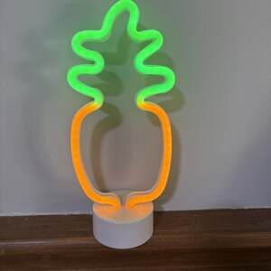 This LED neon tabletop light features a fun pineapple design, perfect for adding a tropical touch to any room. It emits a vibrant green and orange glow, creating a lively ambiance. This light is in excellent condition, showing minimal signs of wear.