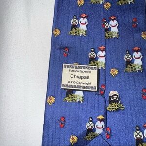 The region features lush jungles, mountains like the Sierra Madre de Chiapas, and stunning natural wonders such as the Sumidero Canyon. This tie brings a little of the region to life. Hand made in silk. Excellent condition