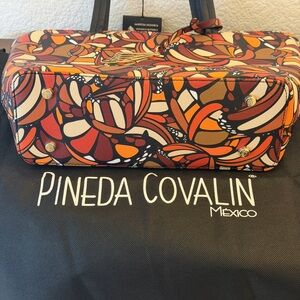 Elevate your style with this vibrant monarch butterfly pattern tote bag from Pineda Covalin featuring bold shades of orange, brown, and black. Ideal for adding flair to any outfit. Brand New with Tags and Includes Dust Bag. Measures 12”w X 10.5”h X 4.5” Aprox. Saffiano leather with feet on the bottom.