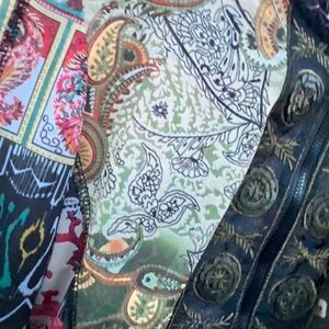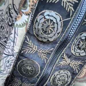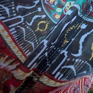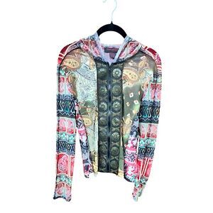 Stylish Boho zip up hooded long sleeve sheer stretchy top with a vibrant mix of colors. Features intricate patterns for a unique look.