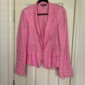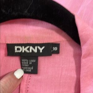 This vibrant pink blazer size 10 DKNY features a professional, tailored design with a classic lapel collar. Made from a 100% linen , it offers a modern twist on a timeless silhouette, perfect for making a bold statement. Has dress to match in closet.