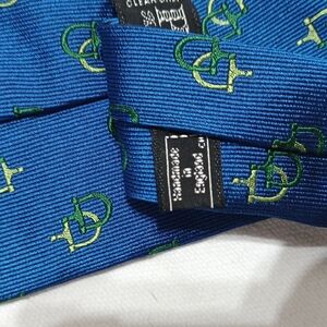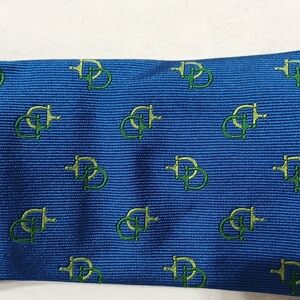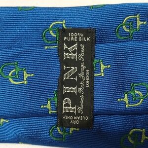 This is a gorgeous pie made of 100% silk hand made in England by Pink comes from London England a hundred percent pure silk in a nice royal blue with a dark green and lighter green Design. It is average 60 in in length would make an excellent gift to anyone who does wear a tie it is like brand new. Retails between 80 and $100 like brand new!