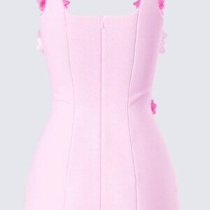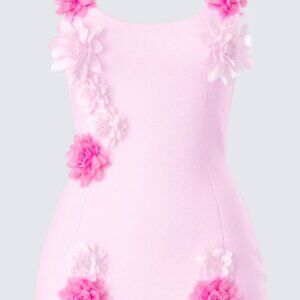 Beautiful pink mini dress with eye-catching 3D floral appliqué details along the straps, neckline, and skirt. Features a square neckline, fitted silhouette, and delicate layered flowers in soft pink and fuchsia for a feminine, romantic look. Perfect for birthdays, parties, weddings, or any special occasion.