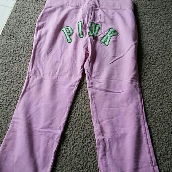 Pink sweatpants size extra small hot pink in color with green and white lettering no rips no stains quick and fast shipping