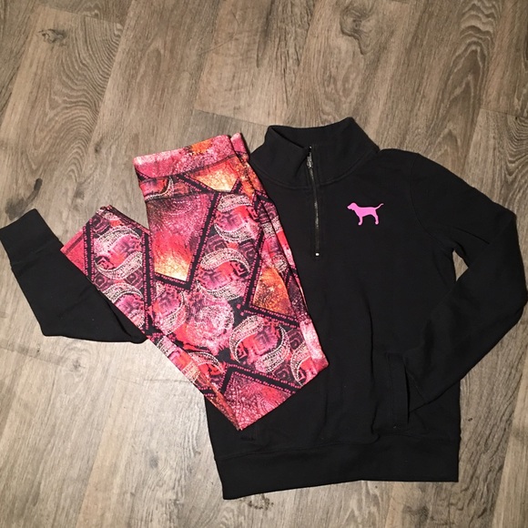 Really unique pink sweater. Bold black and pink with big graphics on the back. The pants are not vs however it’s sold as a set and super cute match😍😍