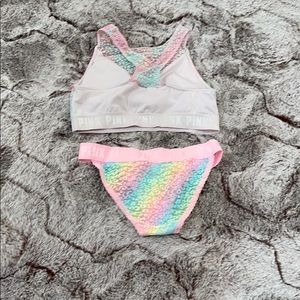 2 piece sports bra and thong panty never worn to small for me, can be worn as a swimming suit also beautiful pink colors bra is large and panty is small