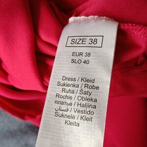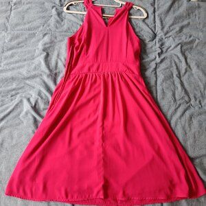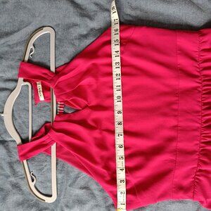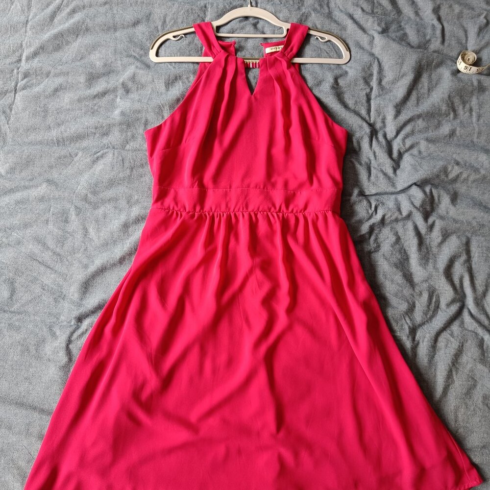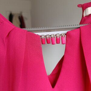 Dress in vibrant, cold pink color (fuchsia), halter-neck design. It has little pink decorative elements in the front, and the neck is closed with a small button at the back. Great for a date night!