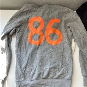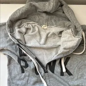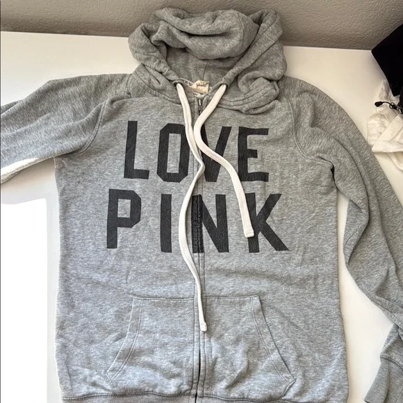 Heather gray zip-up hoodie with bold 'PINK' lettering. Soft inner lining and drawstring hood.