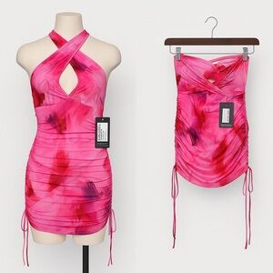 Stylish Pink Abstract Print Slinky Cross Halterneck Detail Bodycon with an abstract pink and red pattern. Features adjustable side ties.