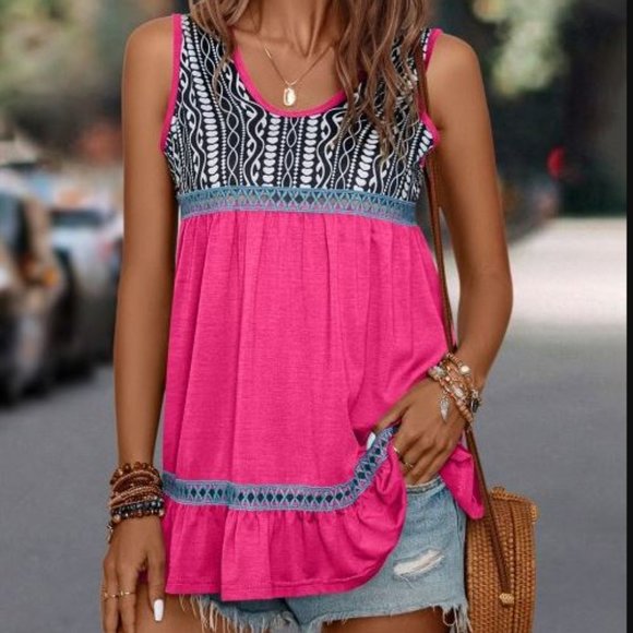 Pink Abstract Ruffle-Hem V-Neck Tank small 95%polyester 5% Spandex