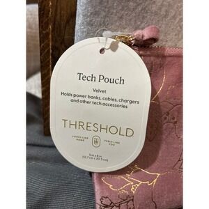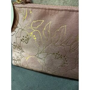 This item is a pink accessory pouch or makeup bag with a gold foil or metallic floral pattern. The design features delicate botanical line work.