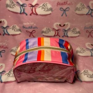 Adorable pink accessory pouch with colorful accents. Perfect for storing small items.