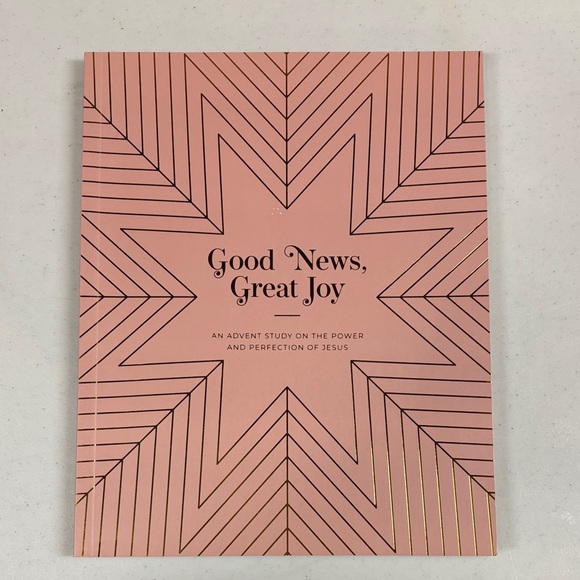 Pink advent study book with geometric design. Features the text 'Good News, Great Joy'.