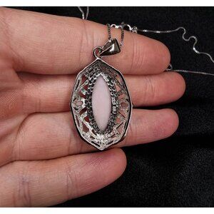 At the heart of this pendant lies a stunning marquise-cut pink agate โ soft as a petal, yet strong as stone. This pale blush gem radiates a sense of inner calm and feminine strength. Polished to a mirror-like glow, the agate seems to hold light within it, reflecting the wearer's grace and self-assurance.