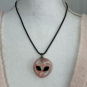 Add a touch of whimsy to your outfit with this pink alien pendant necklace. Perfect for those who love unique and playful jewelry.