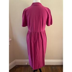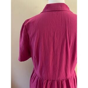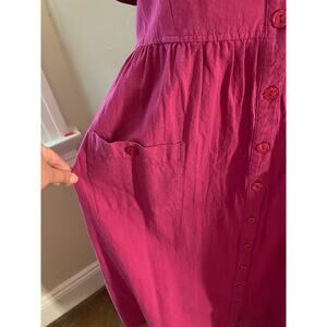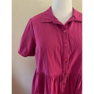 Appleseed's Petites short sleeve babydoll pink cotton dress. Full front button up, collared, two exterior pockets. 100% cotton, calf length.
