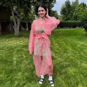 Embrace luxury with this sheer bright peachy pink kimono handmade in Los Angeles by Rita Ghanime. View this "As seen on" from Rita's website - https://www.ritaghanime.com/as-seen-on.html