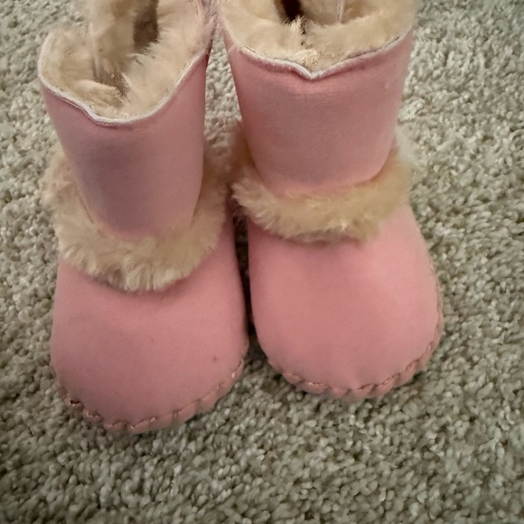Adorable pink baby booties with soft fur trim. Perfect for keeping little feet warm.