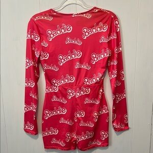 Stylish barbie pink romper with 'Baddie' print. Features long sleeves and a scoop neckline.