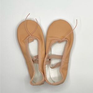 These pink ballet slippers feature a soft, flexible leather construction with elastic straps for a secure fit. Designed for comfort, they have a rounded toe box and a completely flat sole, making them ideal for relaxed dancewear. The light-colored interior lining adds a touch of elegance to these functional ballet 🩰 slippers.