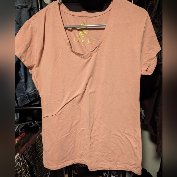This is a salmon colored basic v-neck. It fits like a size large and is made of a soft, stretchy material. Willing to negotiate on price