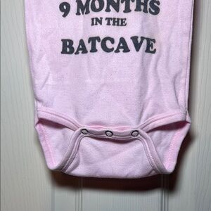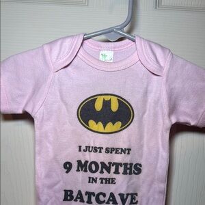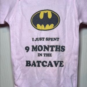 Pink Baby Girl Custom Batman Onesie Size 3-6 Months. Features include short sleeves, snap closure, “I Just Spent 9 Months In The Batcave” writing, custom printed onesie. 65% Polyester 35% Cotton. Good worn condition, no notable flaws. Smoke free home.