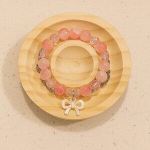 Elegant pink beaded bracelet featuring a charming silver bow. Perfect for adding a touch of sophistication to any outfit.