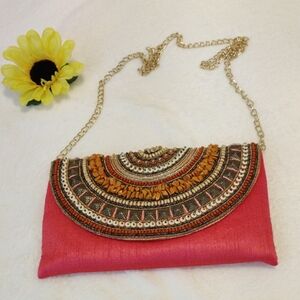 Elegant pink clutch with intricate beadwork and a stylish gold chain. Perfect for adding a pop of color to any outfit.