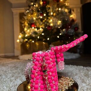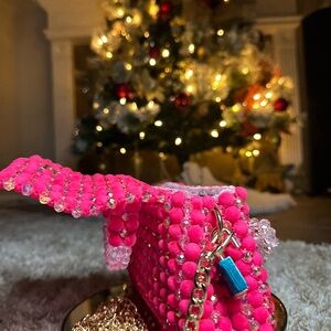 Stylish pink beaded handbag with a unique design. Perfect for adding a pop of color to any outfit.