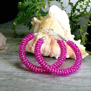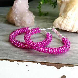 Pink Beaded Hoop Earrings, Seed Bead Jewelry, Handmade Jewelry 1.5"