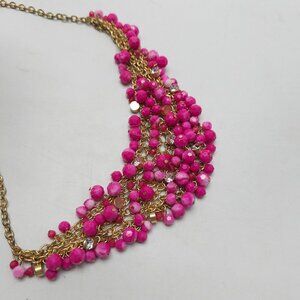 This jewelry set offers an elegant combination of vibrant pink beads and gold-tone chains, accented with rhinestones for a refined, stylish look.