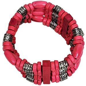 Pink Beaded Stretch Bracelet Silver Tone 1.5 in.