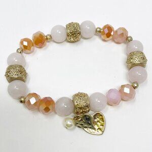 Mix of beads and crystals with gold tone hammered Love Heart, Heart and Pearl Charms on an elastic stretch bracelet band.