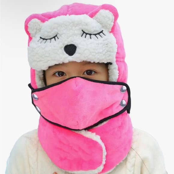 Adorable pink bear-themed winter hat with a matching face cover. Features cute bear ears and a cozy design.
