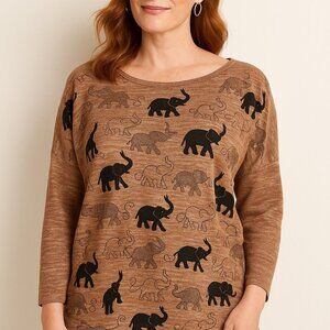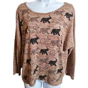 Comfy and cute long sleeve shirt by Pink Berry. Features elephant graphic print on a soft brown heathered fabric with a slouchy casual fit.