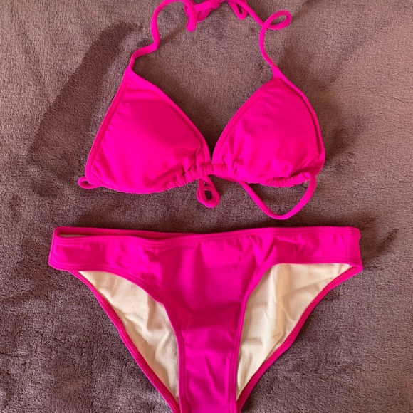 New! In original packaging, never tried on. 2-piece bikini. Triangle top with removable pads, hipster bottom. Juniors sizing.