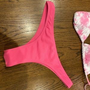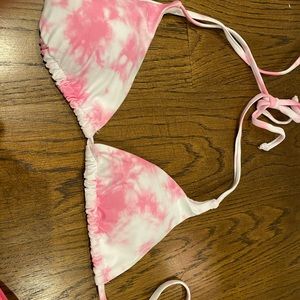 Tie dye triangle bikini top with pink ribbed bikini bottom. Top includes padding. Both pieces size medium.