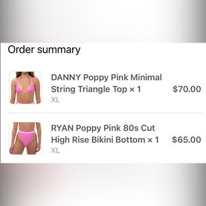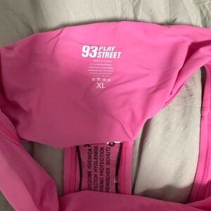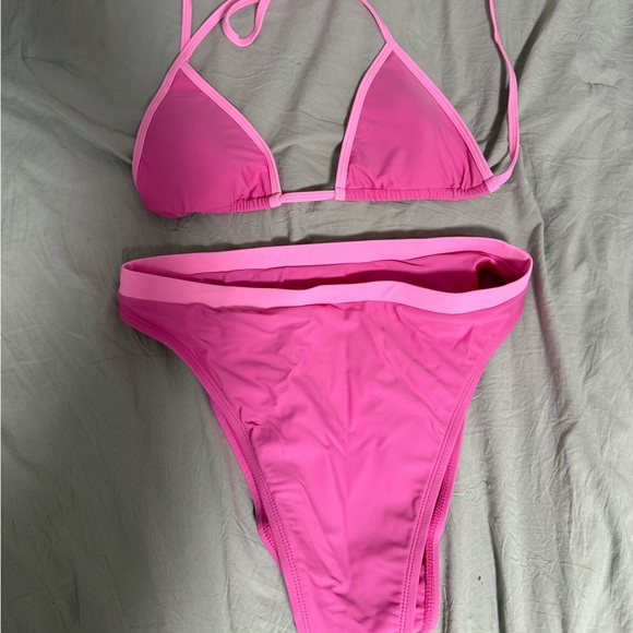 Never worn bikini. Bought on Feb 13th, 2025 for a vacation however it does not fit and the website does not allow returns. High quality and vibrant color! It is high rise and cheeky. Top and bottom are both XL. Brand is 93 Play Street. ***Reason it's priced so high, I bought the bottoms for $65 and the top for $70***