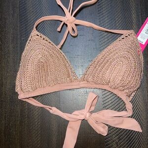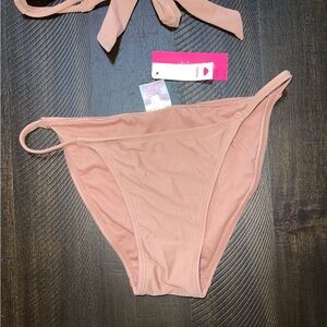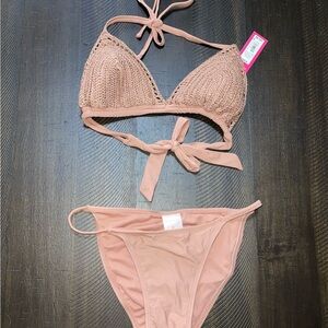 Stylish pink bikini set with a halter top and tie details. Perfect for the beach.